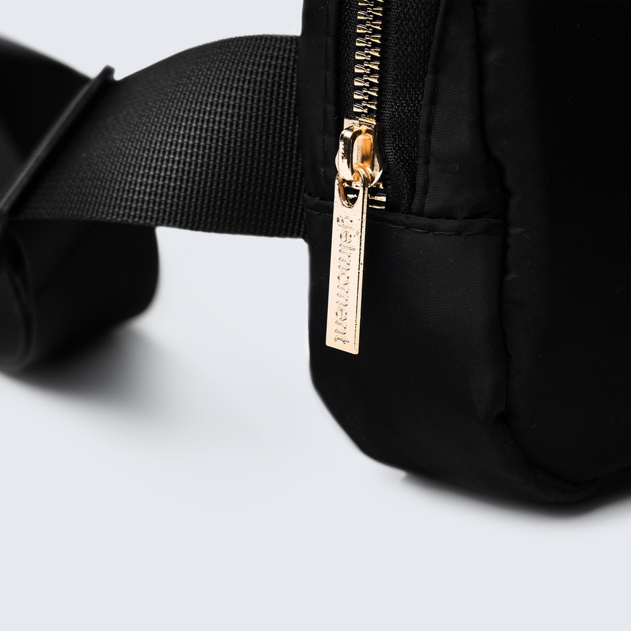 Our belt bag has a perfectly simple, sleek design & neutral black-and-gold colourway that goes with any style of outfit. Enjoy the convenience of keeping small items organized in the slim mesh pockets inside the main compartment, or in the passport-perfect pocket on the outside. Plus, the adjustable strap gives you the option to wear it around your waist or across your body, and its 1L capacity is plenty for all your essentials—so you can have everything on hand, while keeping your hands free!